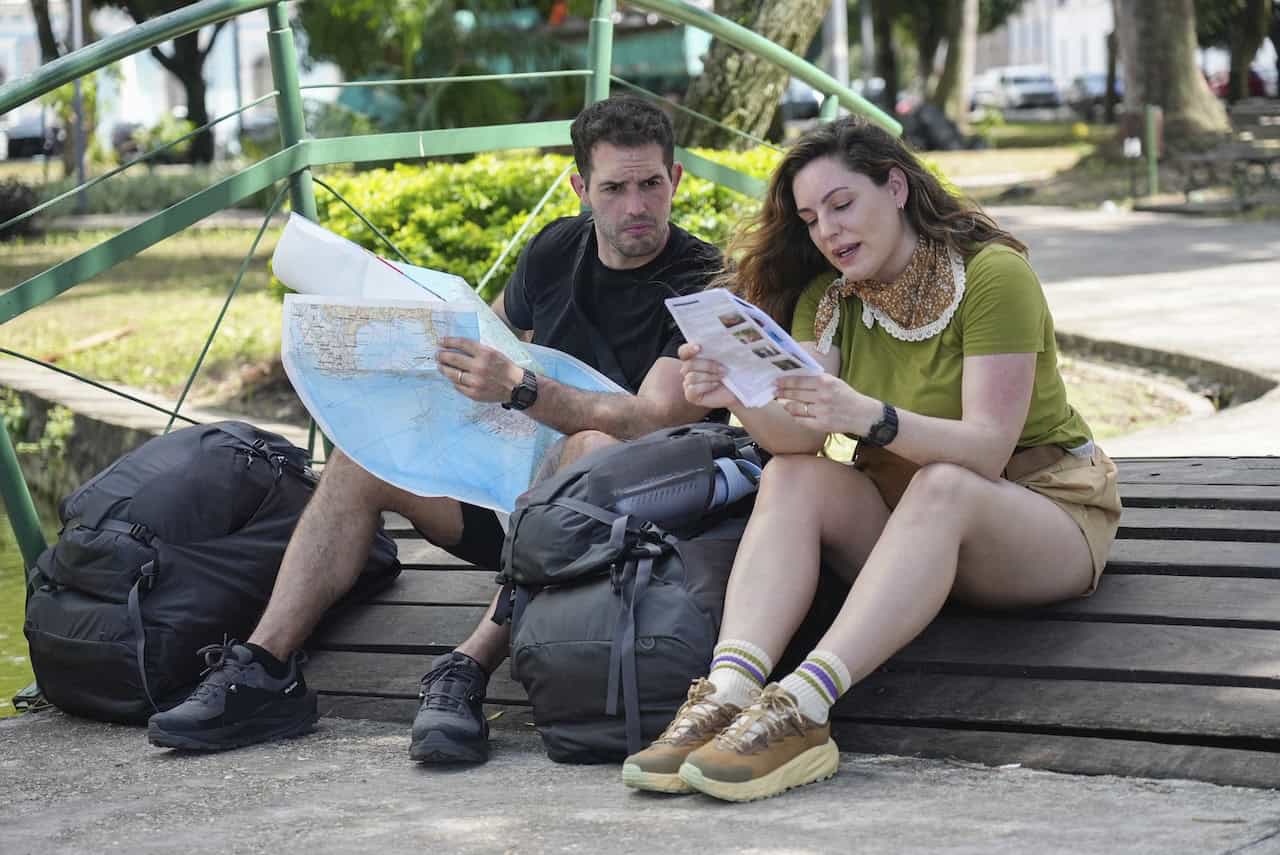 Sam: Travelling without a mobile, obviously, it’s everything in your palm, your maps, your directions, your translator, your wallet. I’m really good with directions, so if I go somewhere once, I know my way around. Scott’s the opposite; he can go on holiday, and he’ll finally get to know his way around the hotel as we’re checking out. He’ll always have to put the sat nav on to go to the train station, even though he goes there every day. So, for me, I’m not worried about the directions, but I’m useless on geography and where everything is, whereas Scott’s good at that. So, although we haven’t got our mobiles and our wallets and everything, we’ll help each other with our strengths and weaknesses. But it’s still going to be difficult that you just can’t pull out a phone and say, “Help me, please!”
